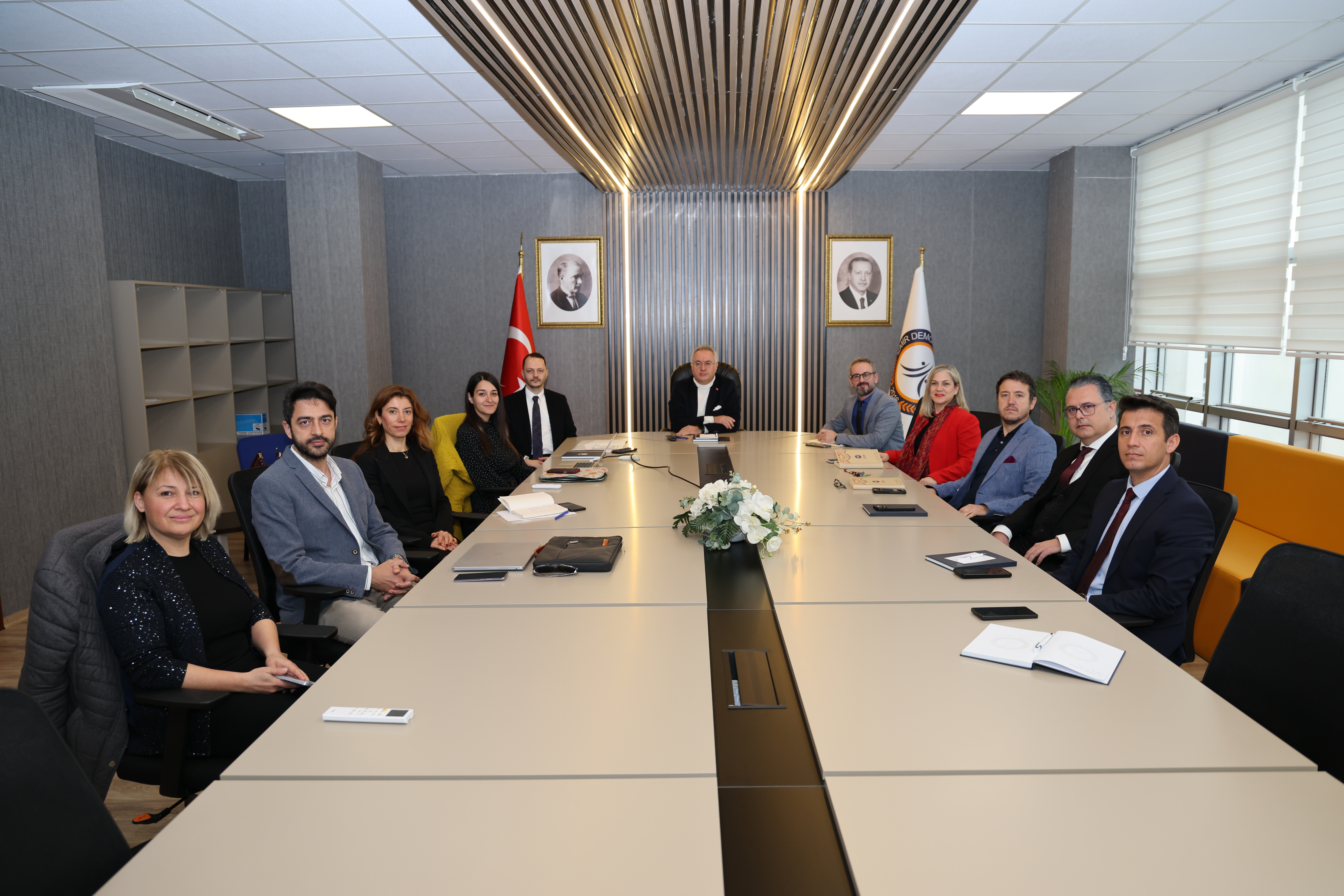 Ege Bölgesi Sanayi Odası Yönetim Kurulu Üyesi ve EBSO Üniversite-Sanayi İş Birliği Koordinasyon Kurulu Başkanı Ali Arda Yüksel, İzmir Demokrasi Üniversitesi Rektörü Prof. Dr. Selim Karahasanoğlu’nu ziyaret etti. Rektör Yardımcısı Prof. Dr. Devrim Ünay’ın da katıldığı görüşmede, EBSO’nun üniversite-sanayi iş birliği kapsamında yürüttüğü çalışmalar ve projeler hakkında bilgi verilirken, iki kurum arasında geliştirilebilecek ortak proje olanakları ele alındı.