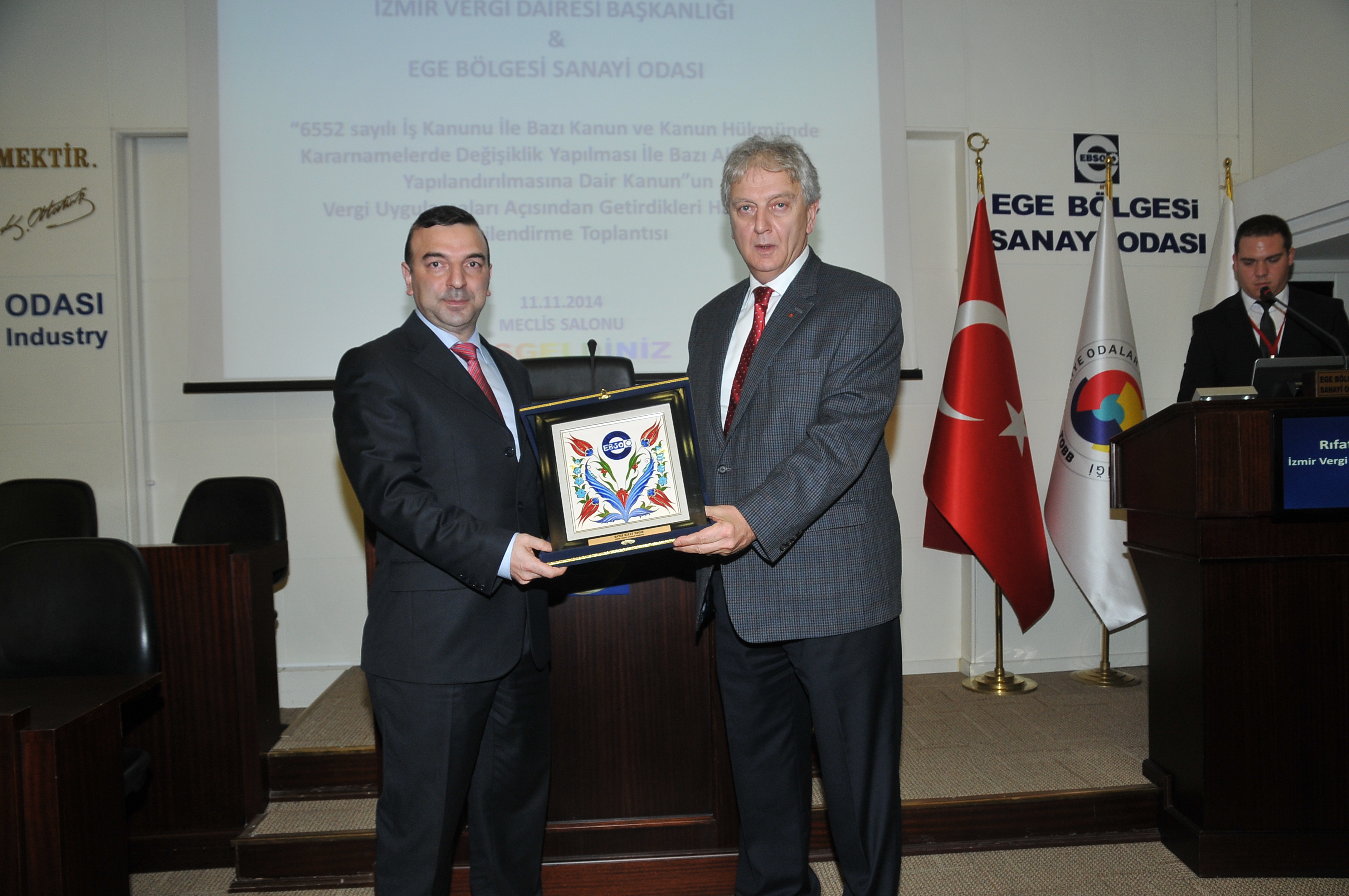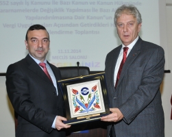 6552 Sayılı İş Kanunu ile Bazı Kanun ve Kanun Hükmünde Kararnamelerde Değişiklik Yapılması ile Bazı Alacakların Yapılandırılmasına Dair Kanun”un vergi uygulamaları açısından getirdikleri hakkında bilgilendirme toplantısı, İzmir Vergi Dairesi Başkanı Rıfat Engin ile İzmir Vergi Dairesi Başkanlığı Tahsilat Müdürü Mustafa Taşar’ın katılımıyla gerçekleştirildi.